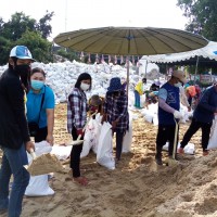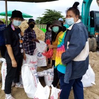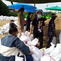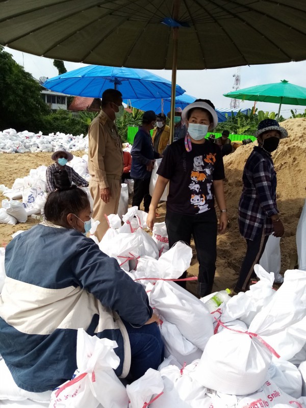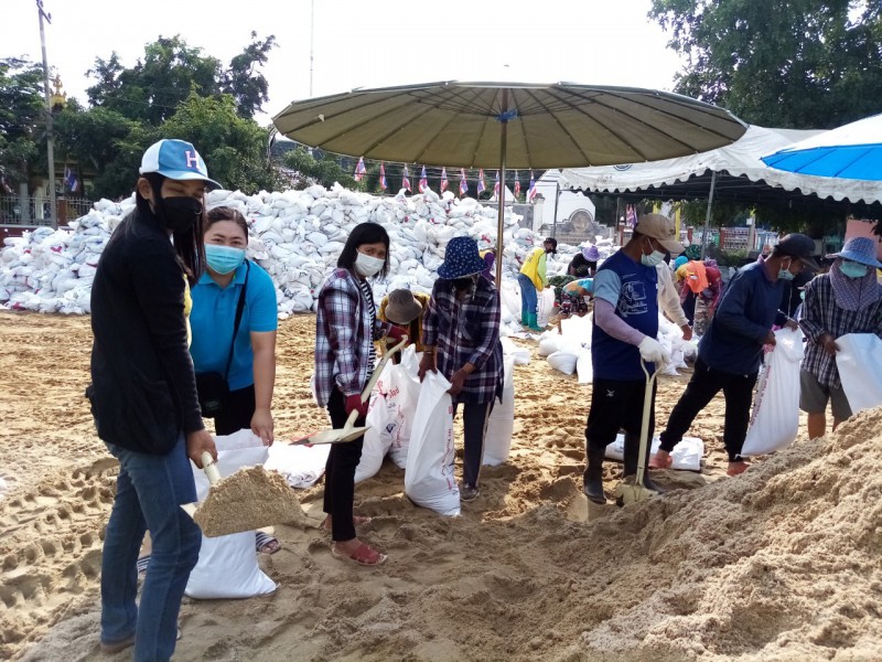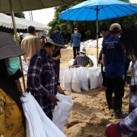 คณะผู้บริหารและคณะครู ร่วมกรอกทรายเพื่อนำไปทำแนวกันน้ำ เพื่อป้องกันน้ำท่วม