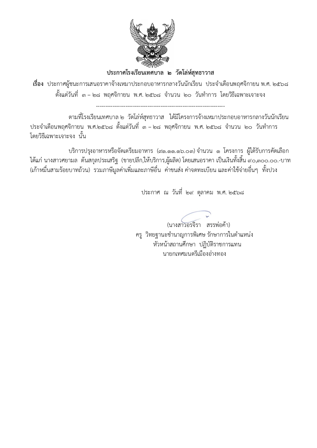 เรื่อง ประกาศผู้ชนะการเสนอราคาจ้างเหมาประกอบอาหารกลางวันนักเรียน ประจำเดือนพฤศจิกายน พ.ศ. 2568 ตั้งแต่วันที่ 3 - 28 พฤศจิกายน พ.ศ. 2568 จำนวน 20 วันทำการ โดยวิธีเฉพาะเจาะจง