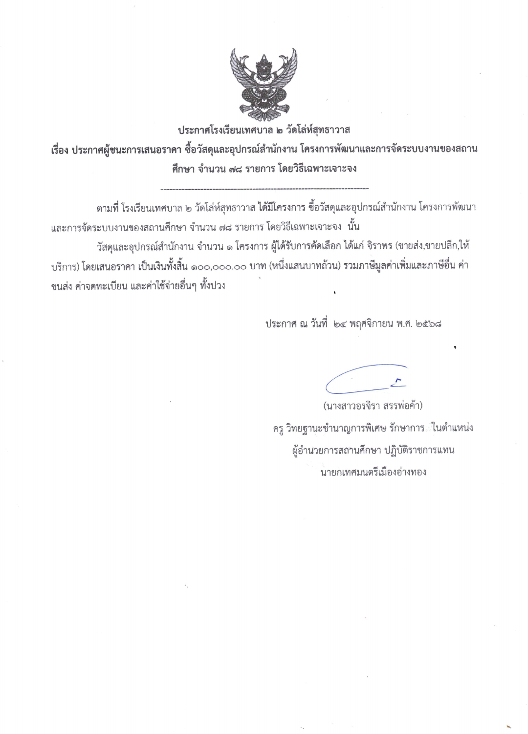 เรื่อง ประกาศผู้ชนะการเสนอราคา การจัดซื้อวัสดุและอุปกรณ์สำนักงาน โครงการพัฒนาและการจัดระบบงานของสถานศึกษา จำนวน 78 รายการ โดยวิธีเฉพาะเจาะจง