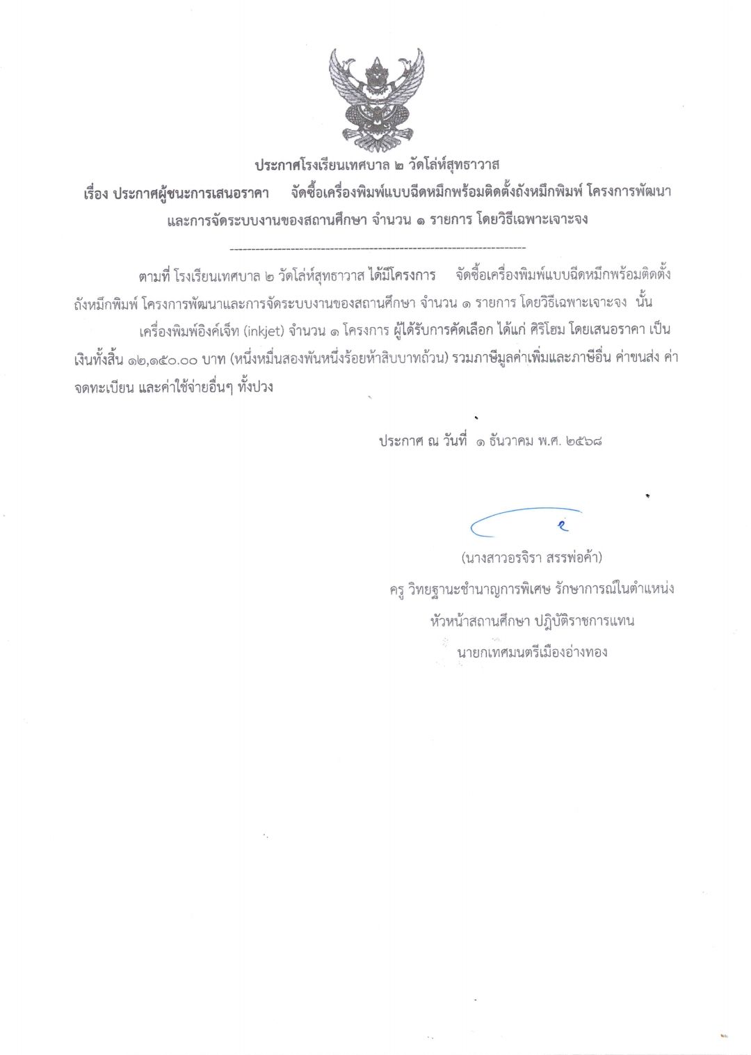 เรื่อง ประกาศผู้ชนะการเสนอราคา การจัดซื้อเครื่องพิมพ์แบบฉีดหมึกพร้อมติดตั้งถังหมึกพิมพ์ โครงการพัฒนาและการจัดระบบงานของสถานศึกษา จำนวน 1 รายการ โดยวิธีเฉพาะเจาะจง